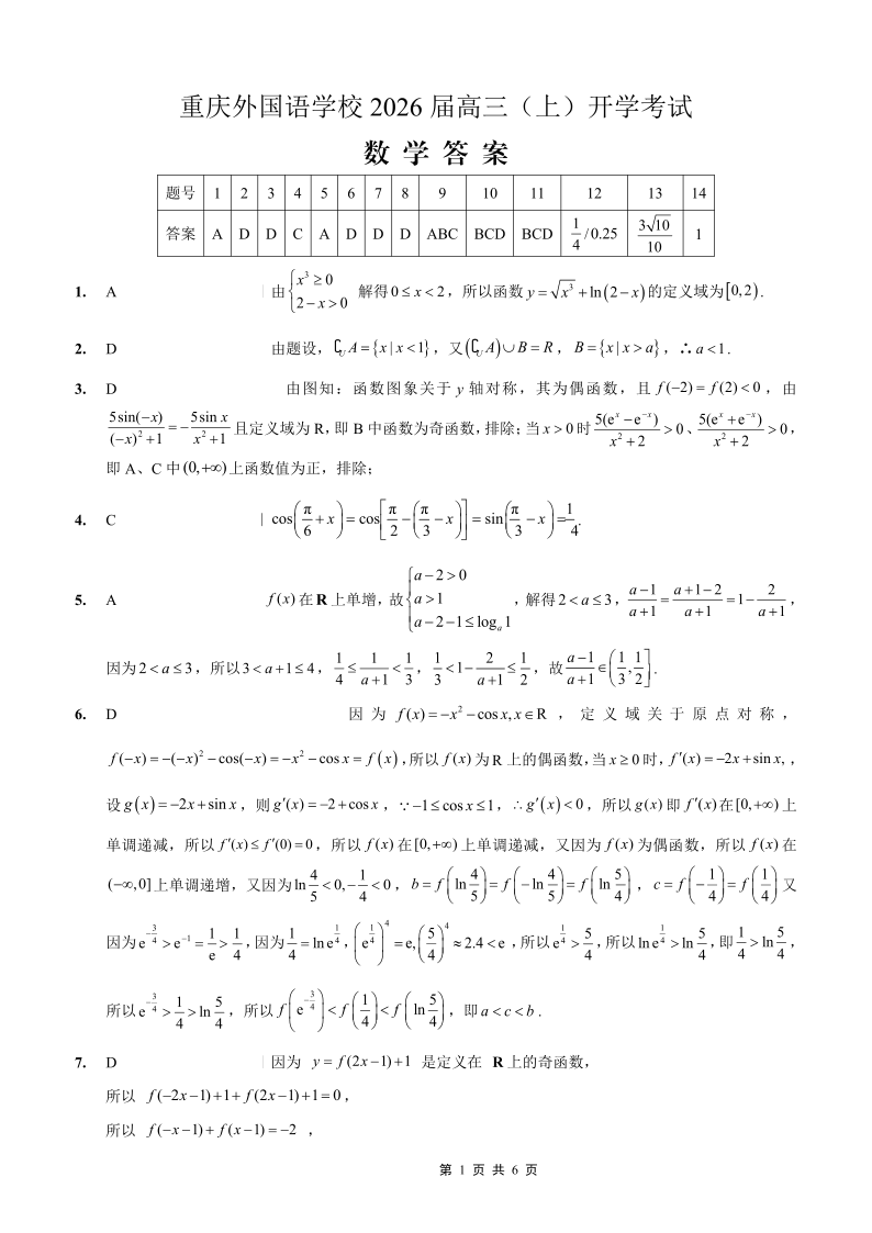 重庆外国语学校2026届高三(上)开学考试 数学答案.pdf