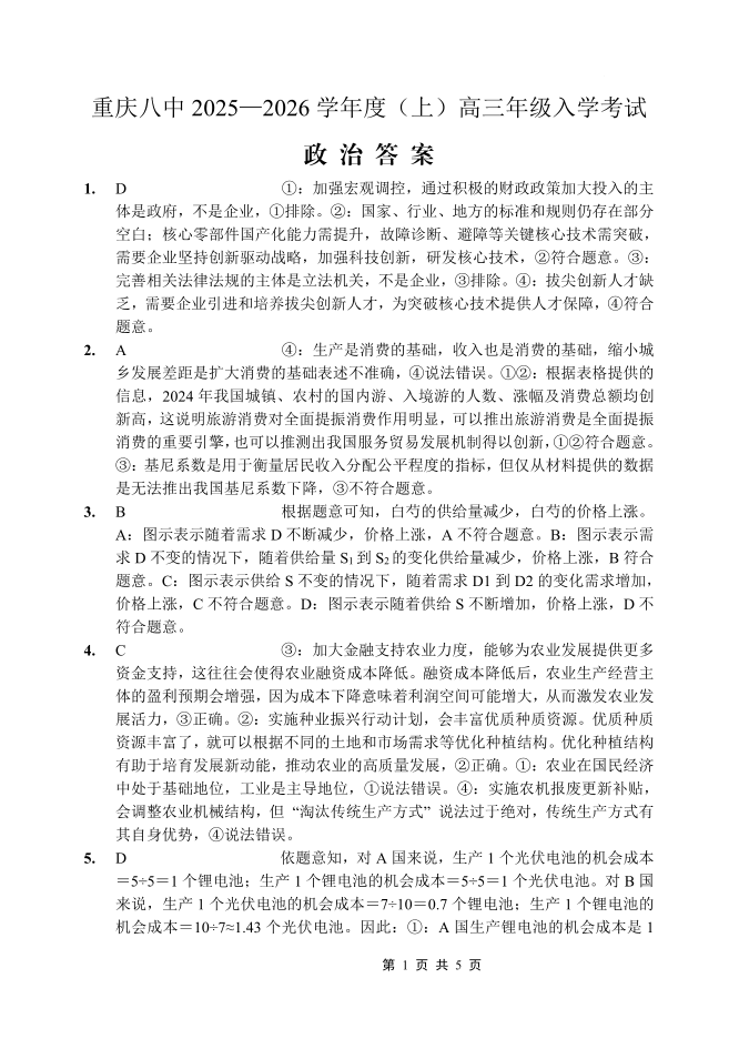 重庆八中2025-2026学年度(上)高三年级入学考试 政治答案.pdf