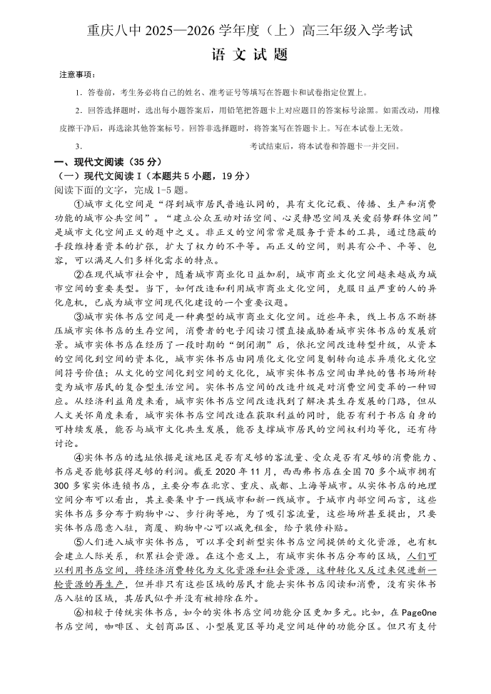 重庆八中2025-2026学年度(上)高三年级入学考试 语文.pdf