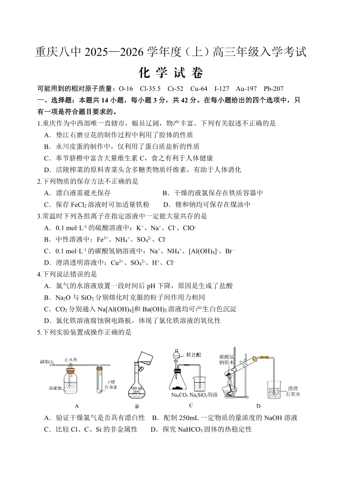 重庆八中2025-2026学年度(上)高三年级入学考试 化学.pdf