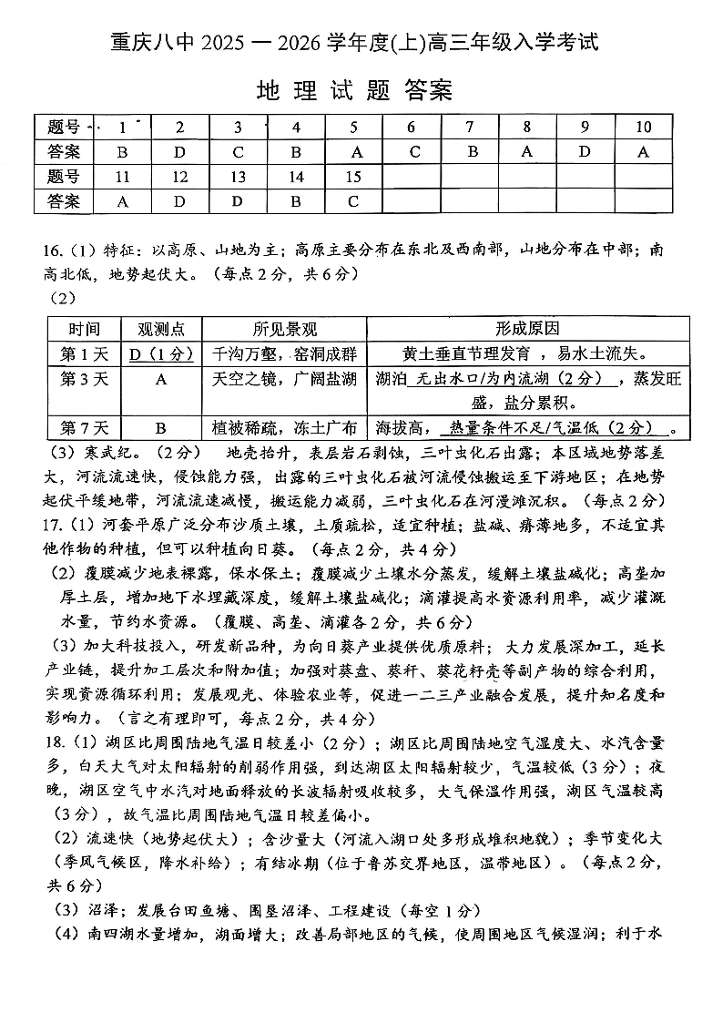 重庆八中2025-2026学年度(上)高三年级入学考试 地理答案.pdf