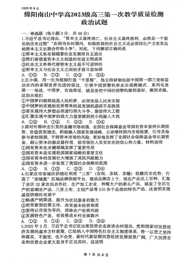 四川省绵阳南山中学2026届高三上学期第一次教学质量检测试题 政治试卷(含答案).pdf