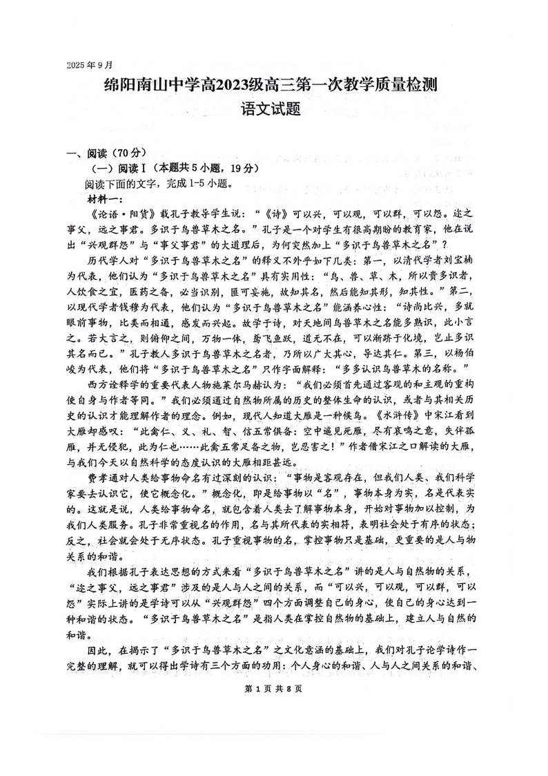 四川省绵阳南山中学2026届高三上学期第一次教学质量检测试题 语文试卷(含答案).pdf