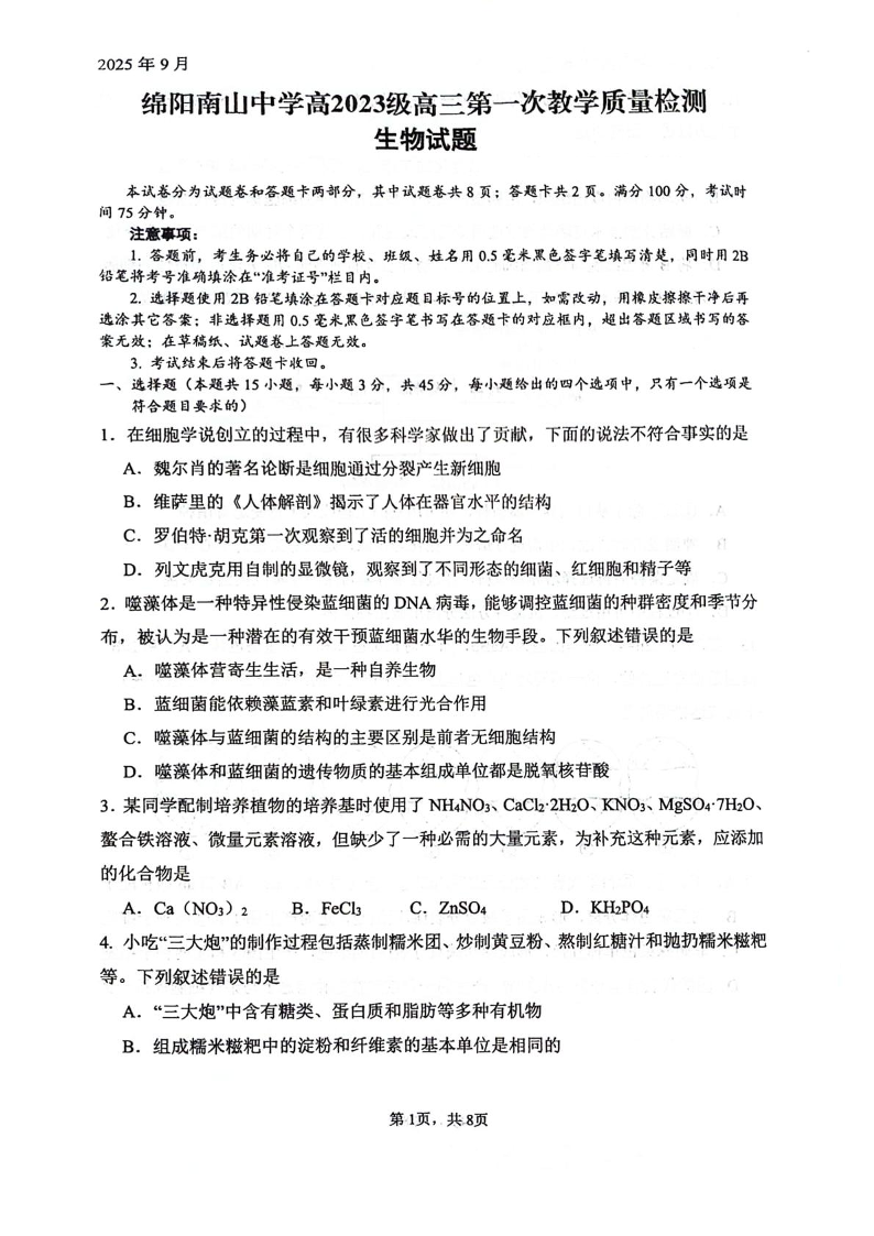 四川省绵阳南山中学2026届高三上学期第一次教学质量检测试题 生物试卷(含答案).pdf