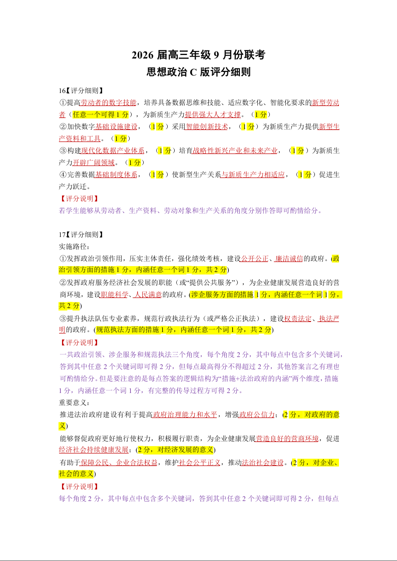 2026届高三年级9月份联考 政治评分细则.doc
