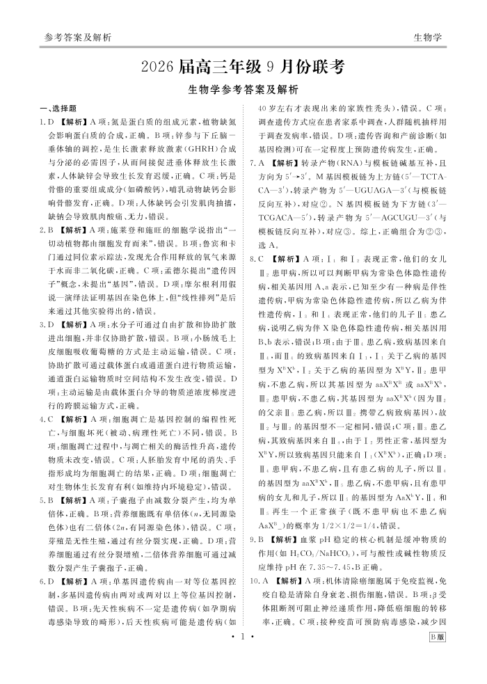 2026届高三年级9月份联考 生物答案.pdf