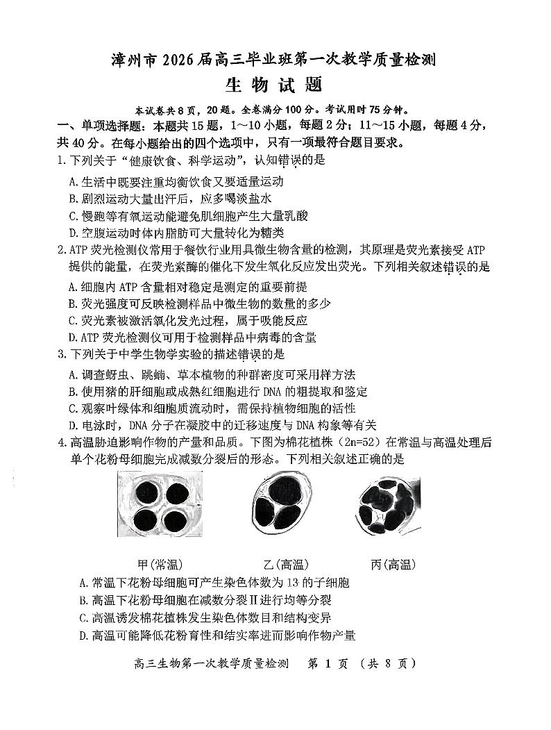 漳州市2026届高中毕业班第一次质量检测 生物.pdf