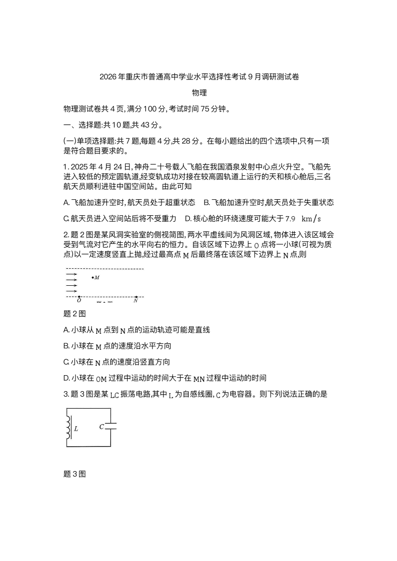 重庆市2026年普通高等学校招生全国统一考试9月调研测试 物理试题(含答案).pdf