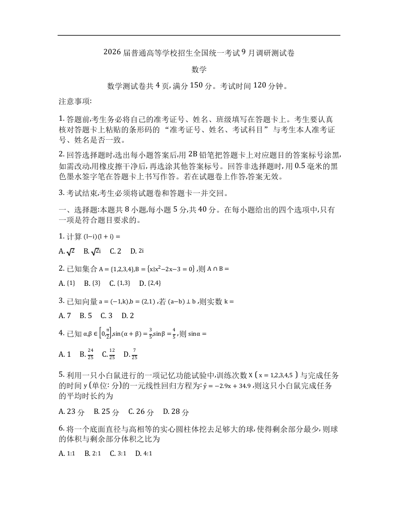 重庆市2026年普通高等学校招生全国统一考试9月调研测试 数学.docx