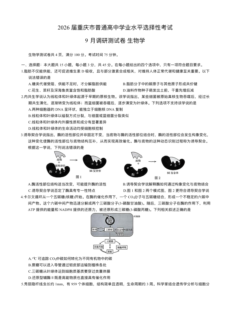 重庆市2026年普通高等学校招生全国统一考试9月调研测试 生物试题(含答案).pdf