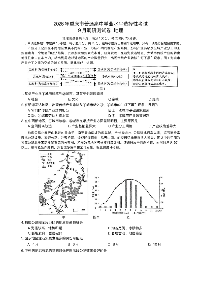 重庆市2026年普通高等学校招生全国统一考试9月调研测试 历史试题(含答案).pdf