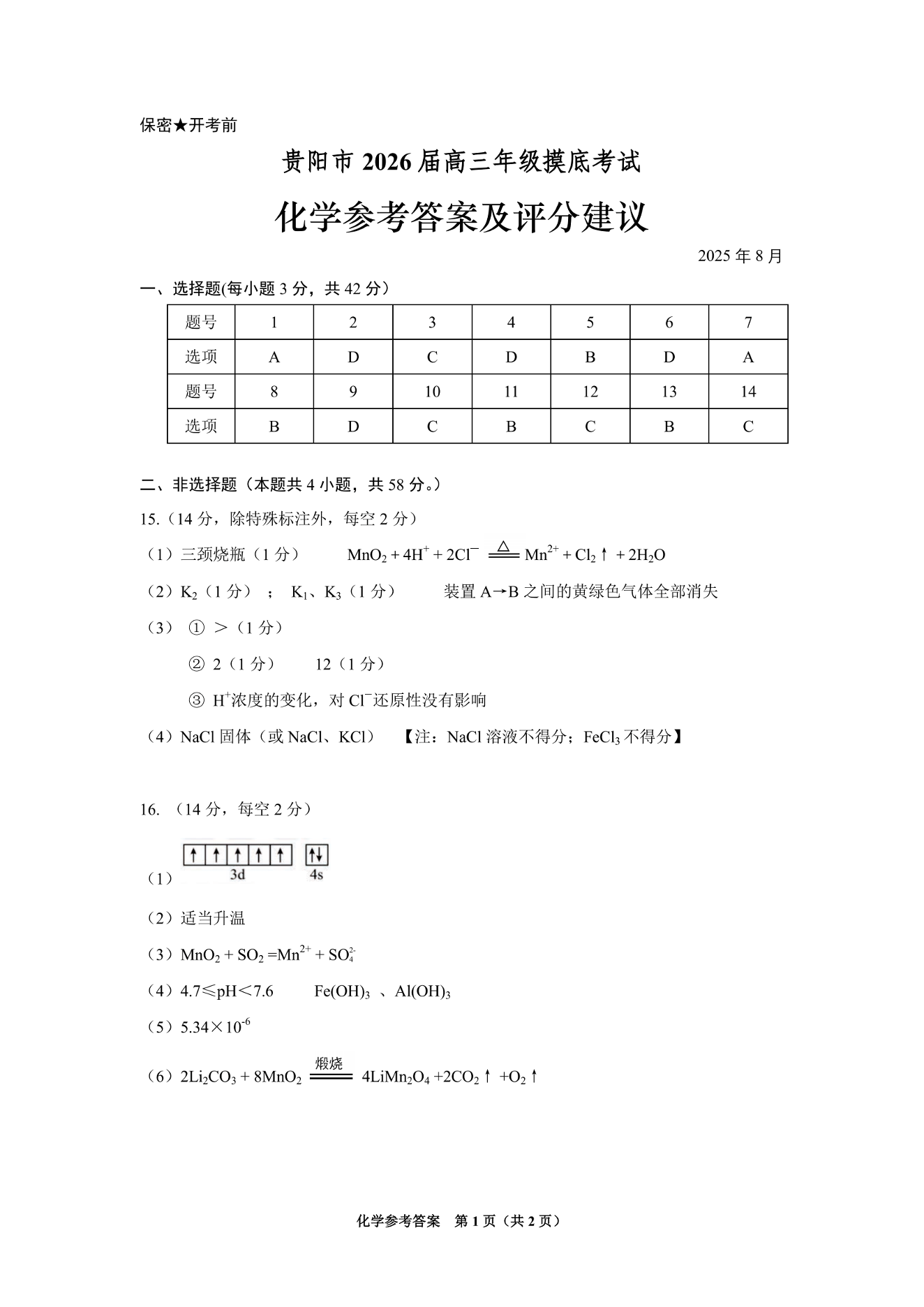 贵阳市2026届高三年级摸底考试试卷 化学答案.pdf