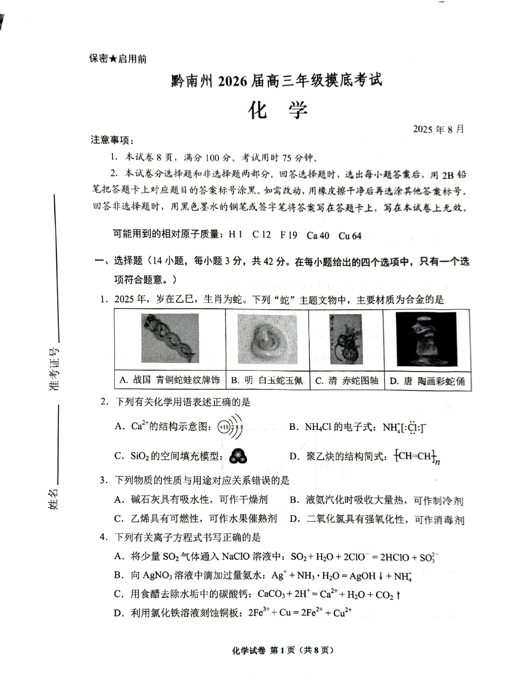 贵阳市2026届高三年级摸底考试试卷 化学.pdf