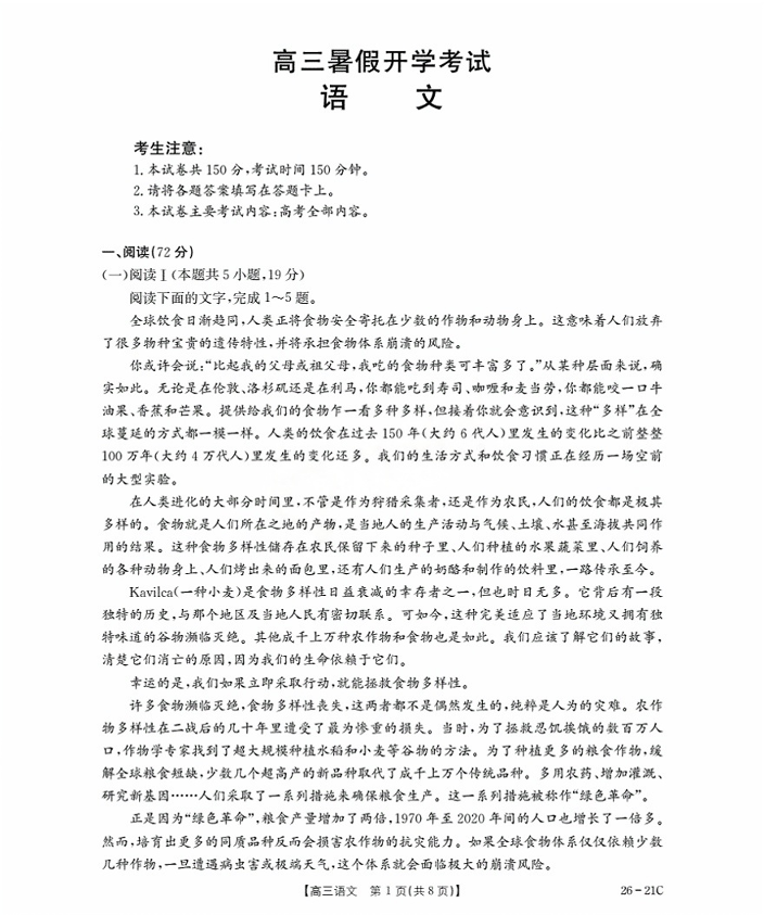 河北省衡水市桃城区2026届高三上学期暑假开学考试 语文试卷(含答案).pdf