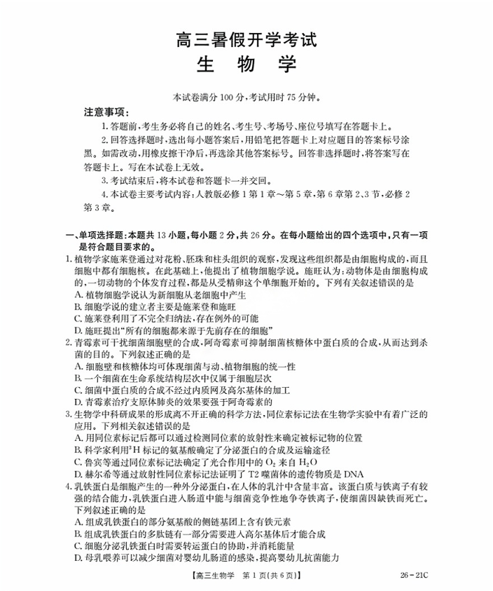 河北省衡水市桃城区2026届高三上学期暑假开学考试 生物试卷(含答案).pdf
