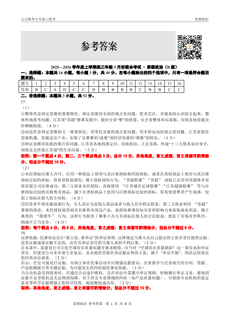 点石联考2025-2026学年度上学期高三年级9月份联合考试 政治(B版)答案.pdf