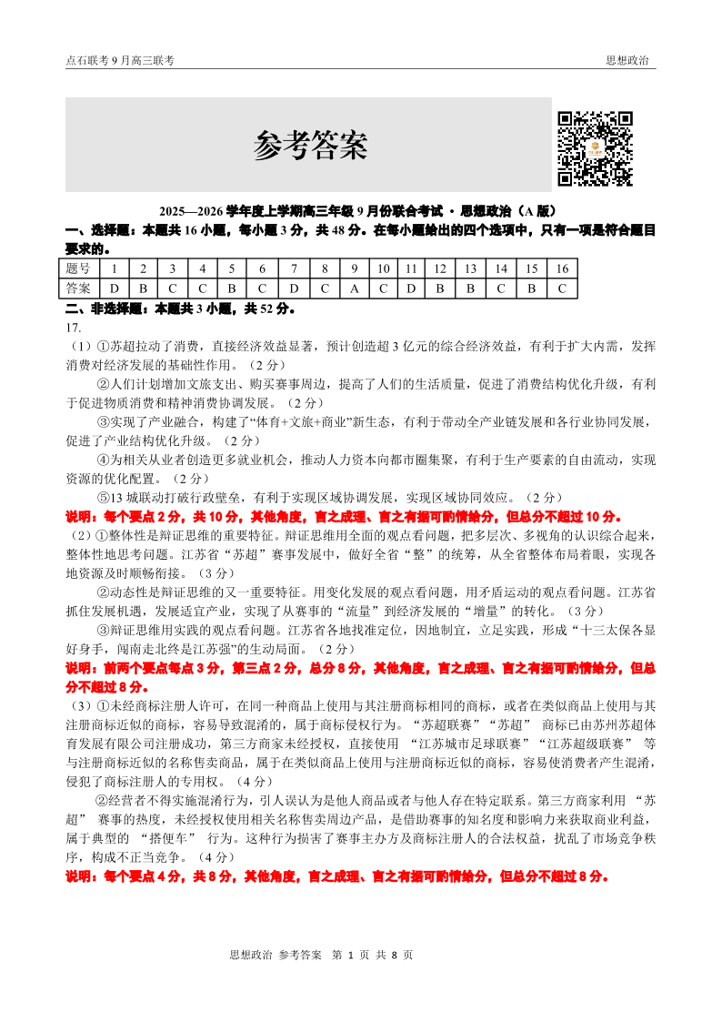 点石联考2025-2026学年度上学期高三年级9月份联合考试 政治(A版)答案.pdf