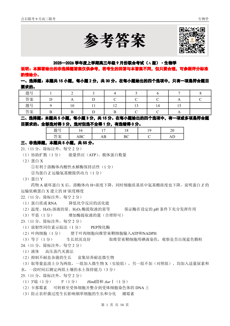 点石联考2025-2026学年度上学期高三年级9月份联合考试 生物(A版)答案.pdf