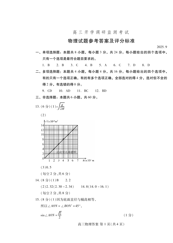 潍坊市2026届高三开学调研监测考试 物理答案.pdf