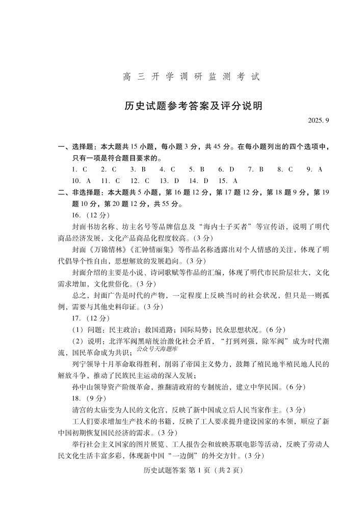 潍坊市2026届高三开学调研监测考试 历史答案.pdf