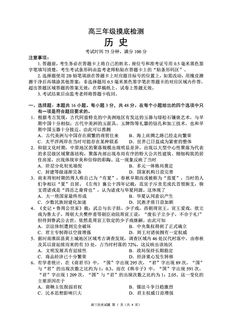 成都市蓉城名校联盟2025-2026学年高三上学期开学联考 历史试卷(含答案).pdf
