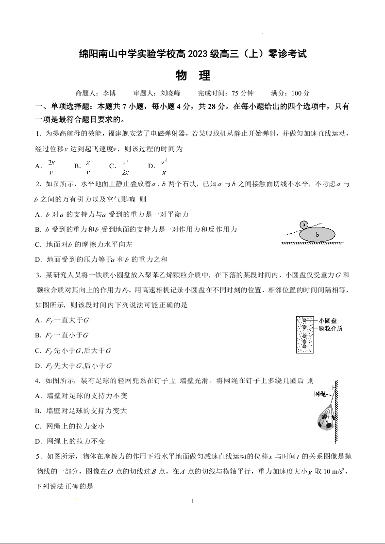 绵阳南山中学实验学校2025-2026学年高三上学期9月月考 物理.docx