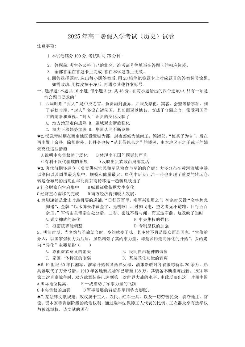 邵阳市第二中学2025-2026学年高二上学期入学考试 历史.pdf