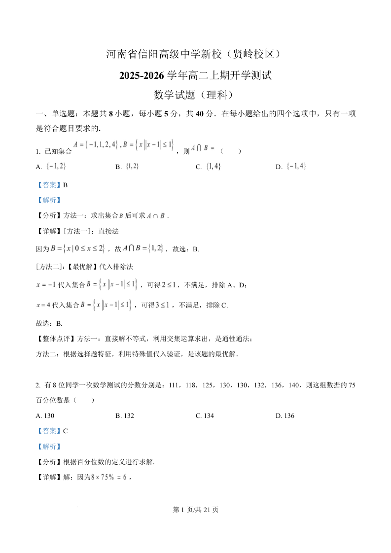 河南省信阳高级中学2025-2026学年高二上学期开学考试 数学答案.docx