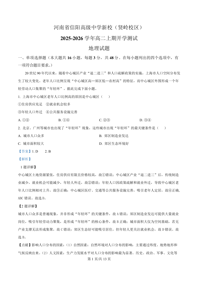 河南省信阳高级中学2025-2026学年高二上学期开学考试 地理答案.docx