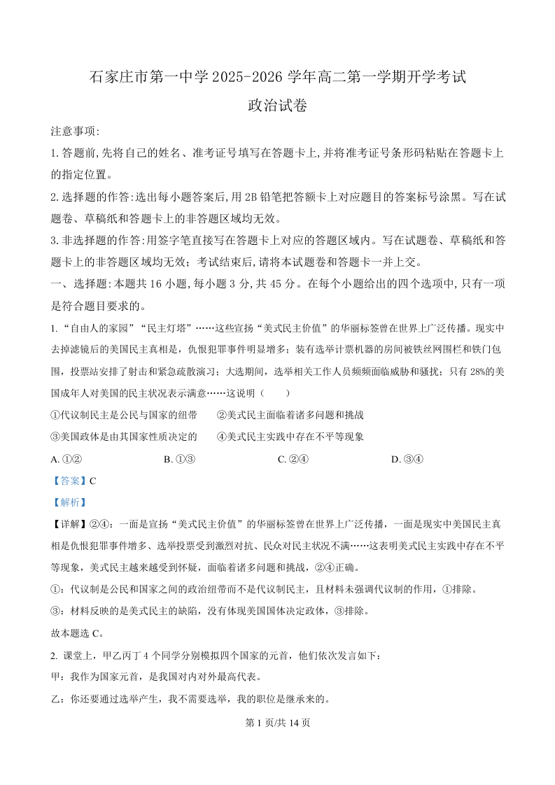 河北省石家庄市第一中学2025-2026学年高二上学期开学考试 政治答案.docx