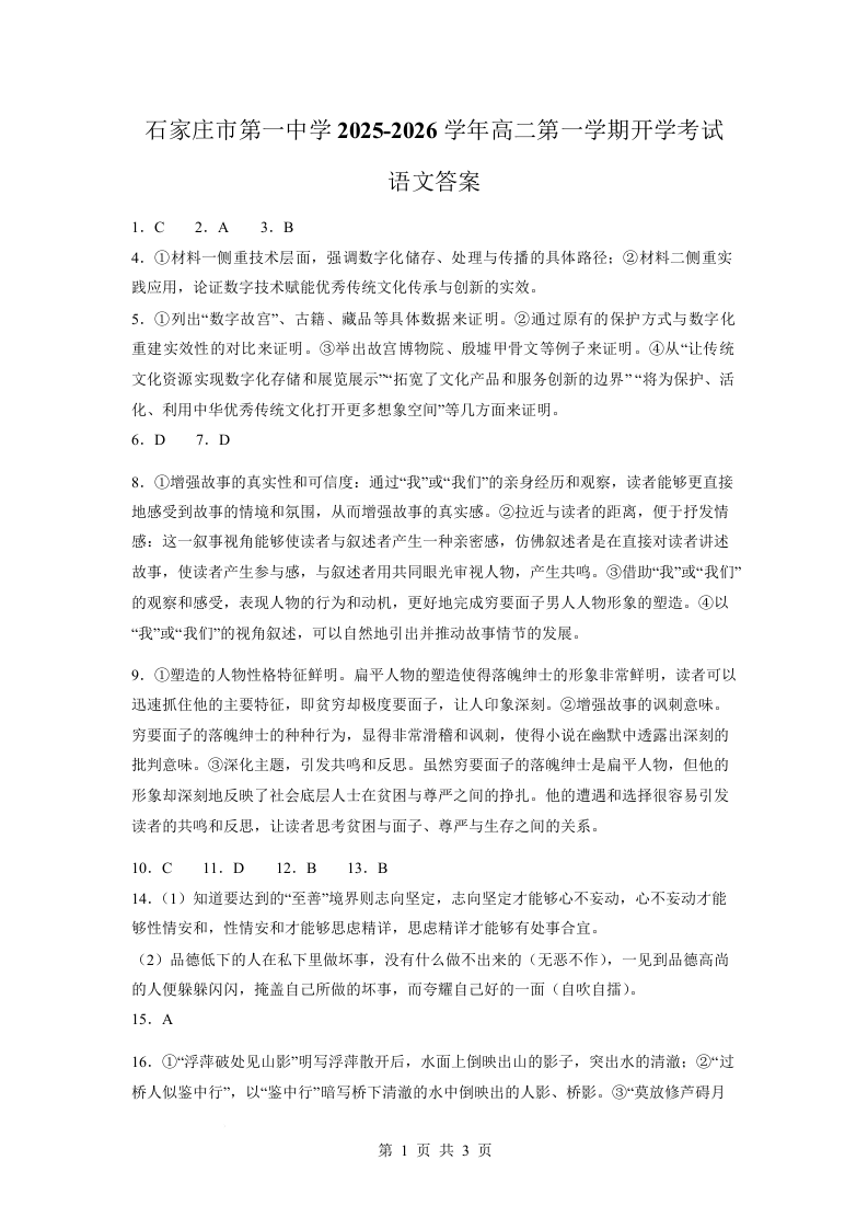 河北省石家庄市第一中学2025-2026学年高二上学期开学考试 语文答案.docx