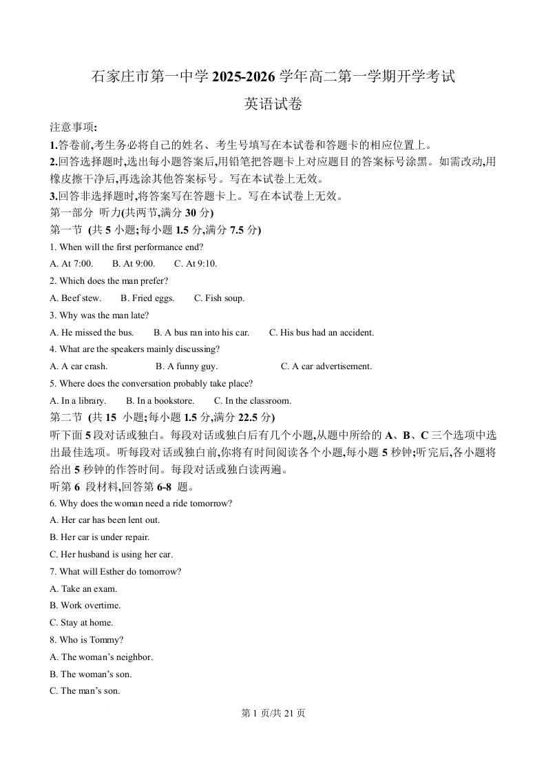 河北省石家庄市第一中学2025-2026学年高二上学期开学考试 英语答案.docx