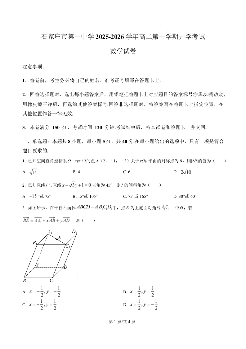 河北省石家庄市第一中学2025-2026学年高二上学期开学考试 数学.docx