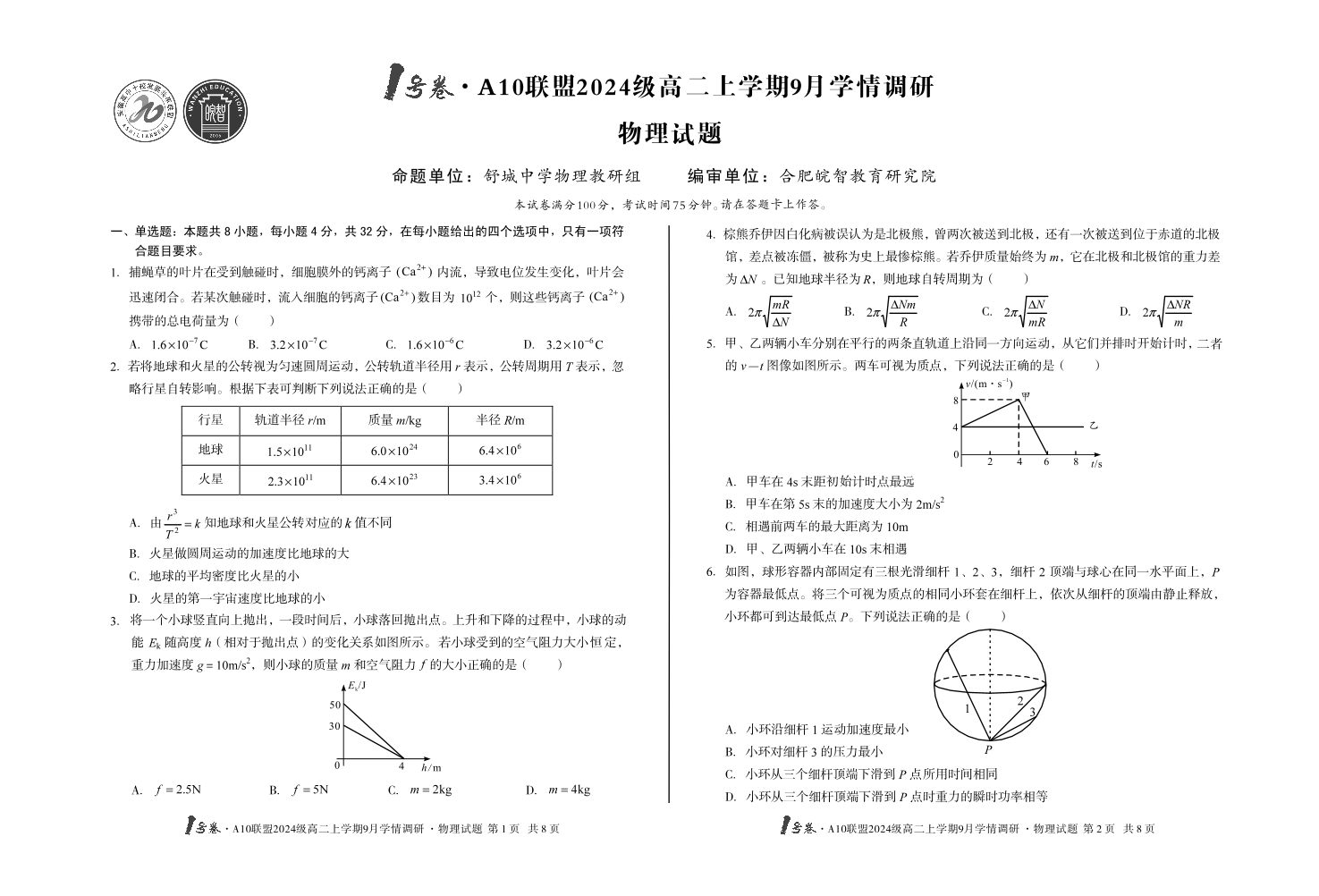 1号卷·A10联盟2024级高二上学期9月学情调研 物理.pdf