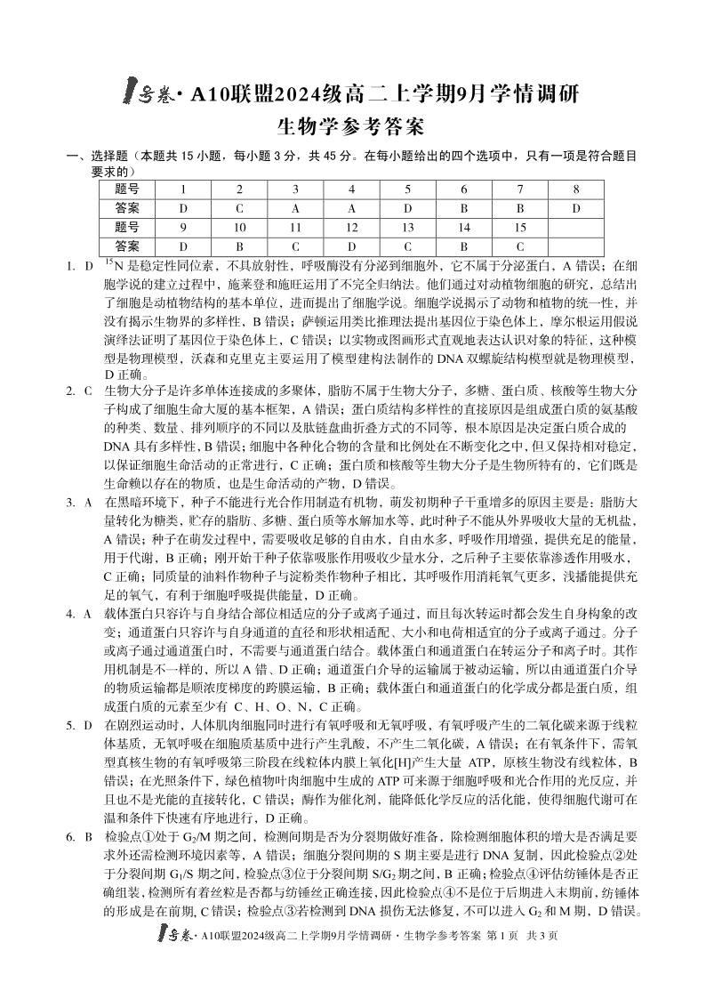 1号卷·A10联盟2024级高二上学期9月学情调研 生物学答案.pdf