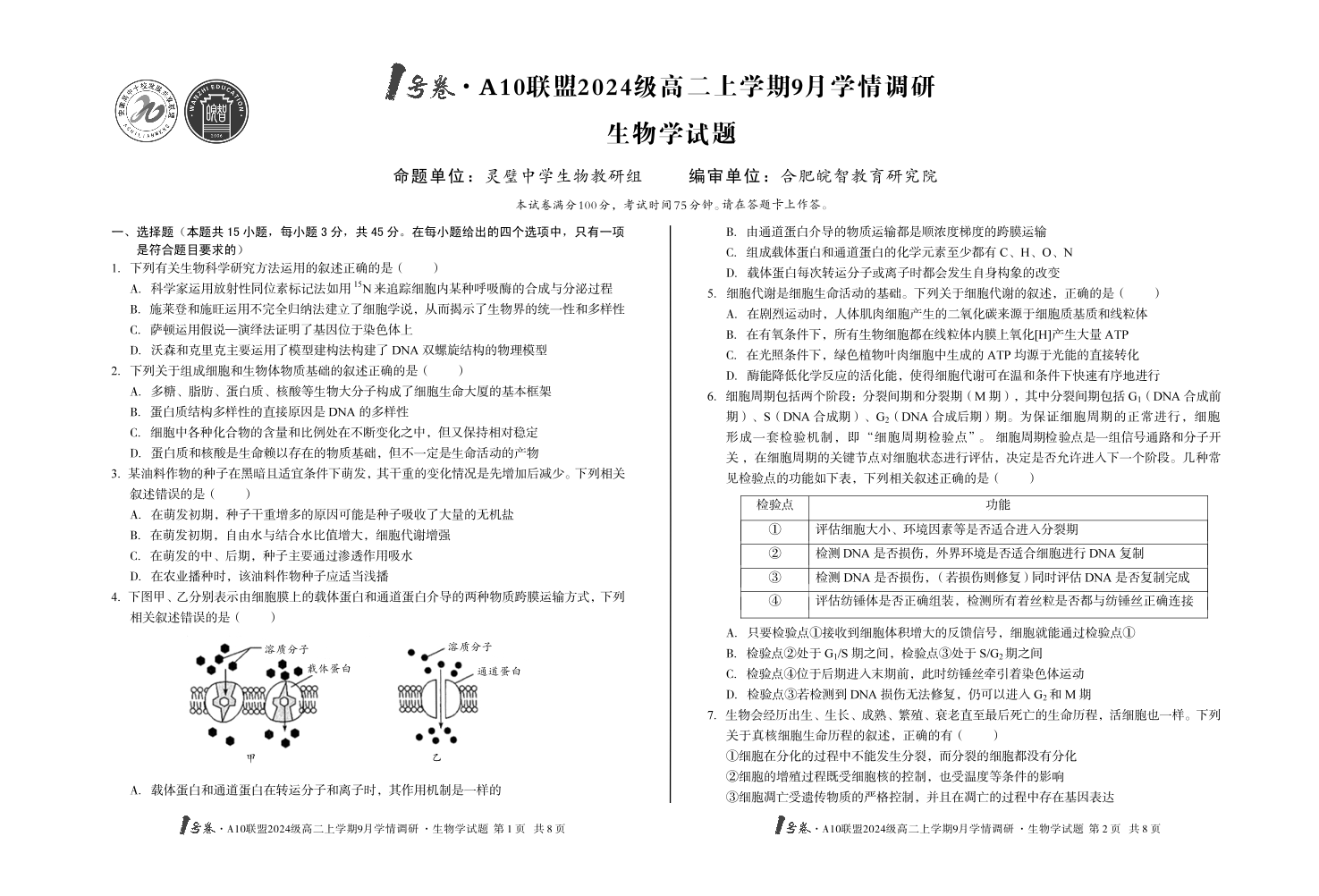 1号卷·A10联盟2024级高二上学期9月学情调研 生物学.pdf