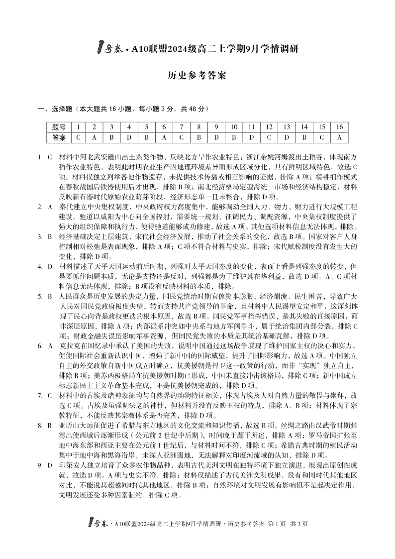 1号卷·A10联盟2024级高二上学期9月学情调研 历史答案.pdf
