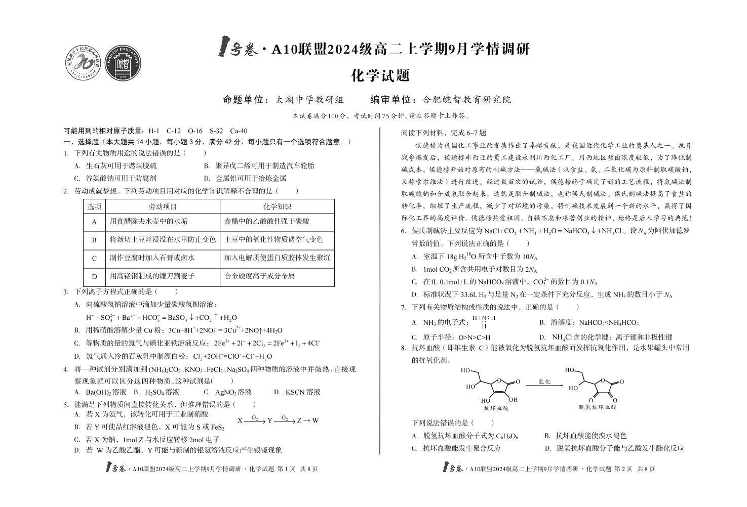 1号卷·A10联盟2024级高二上学期9月学情调研 化学.pdf