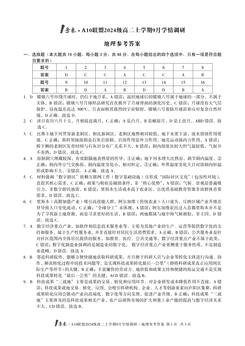 1号卷·A10联盟2024级高二上学期9月学情调研 地理答案.pdf