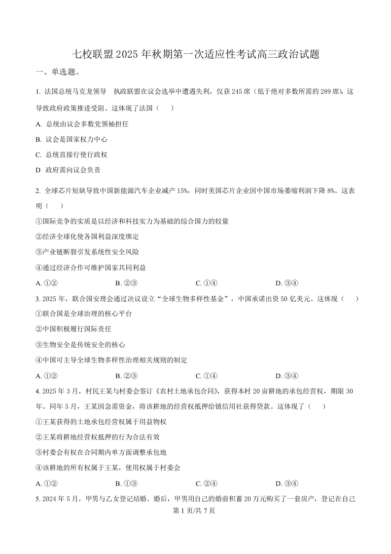 重庆市七校联盟2026届高三上学期第一次适应性考试 政治.docx