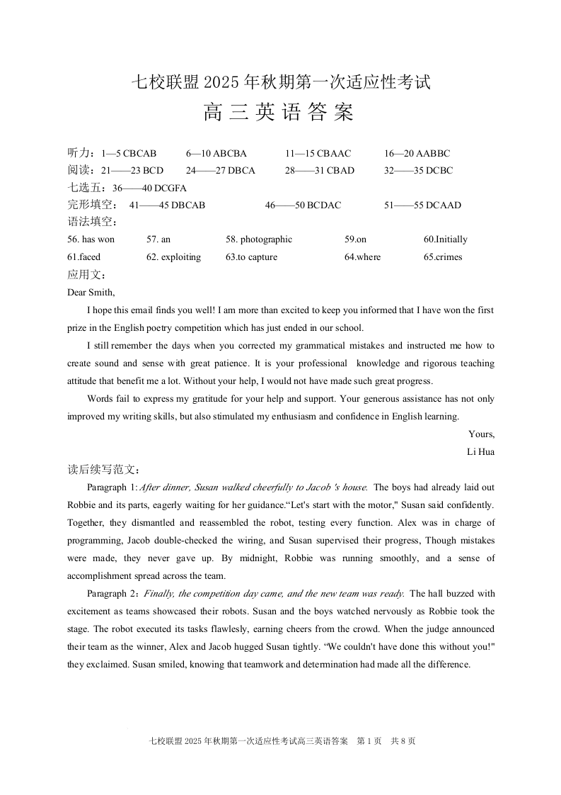 重庆市七校联盟2026届高三上学期第一次适应性考试 英语答案.docx
