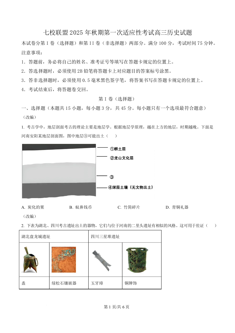重庆市七校联盟2026届高三上学期第一次适应性考试 历史.docx