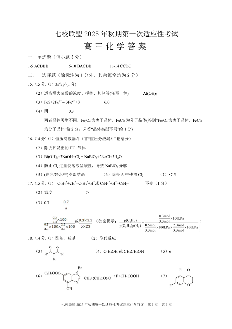 重庆市七校联盟2026届高三上学期第一次适应性考试 化学答案.docx