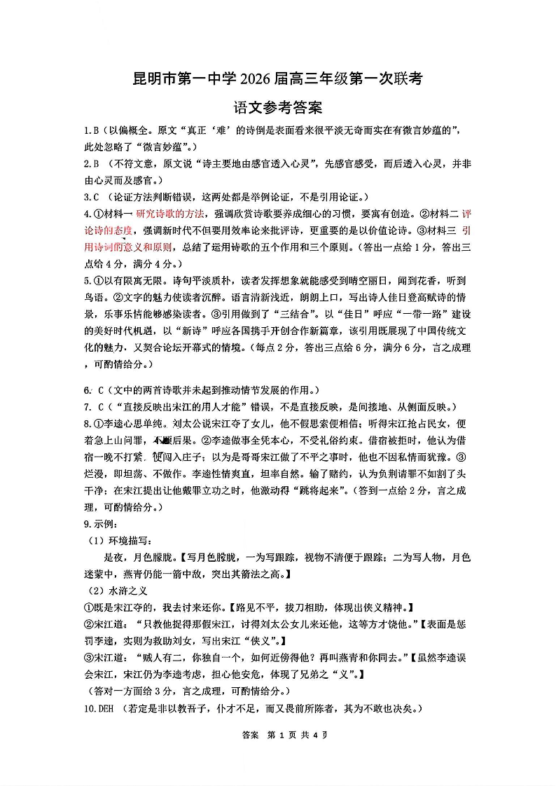昆明市第一中学2026届高三年级第一次联考 语文答案.pdf