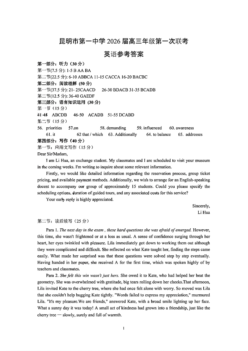 昆明市第一中学2026届高三年级第一次联考 英语答案.pdf