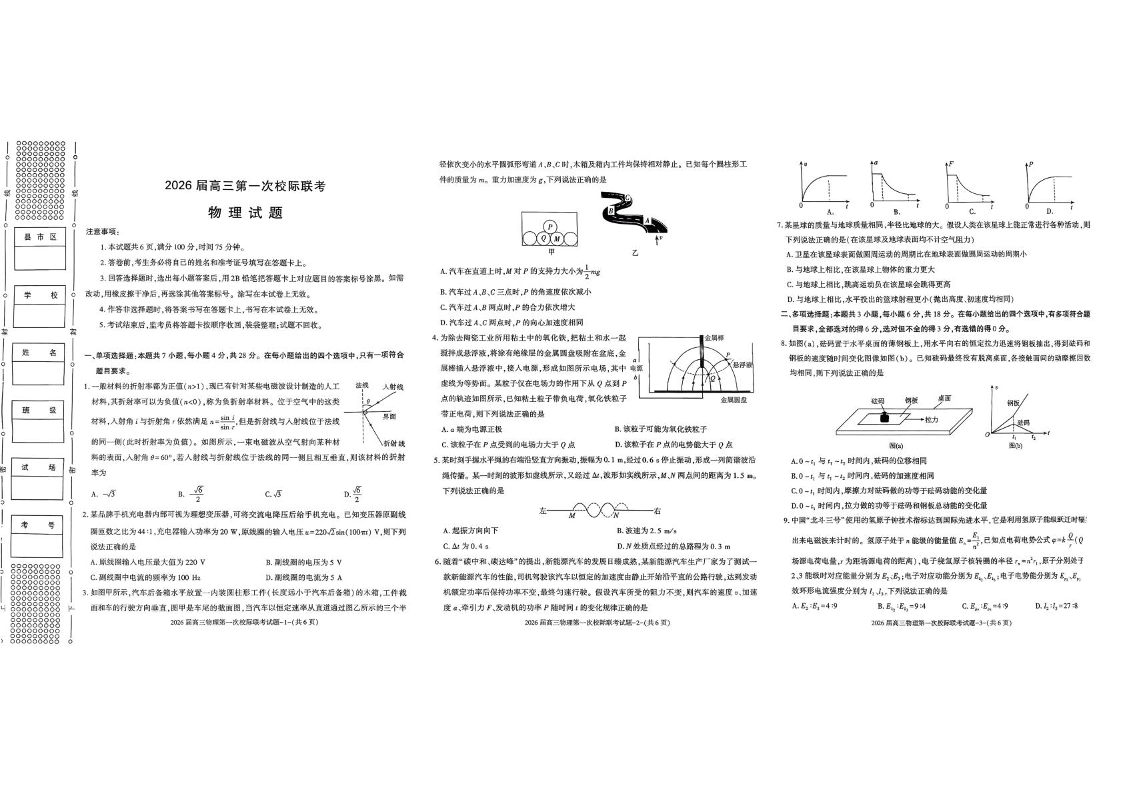 陕西省汉中市2026届高三上学期第一次校际联考 物理试卷(含答案).pdf