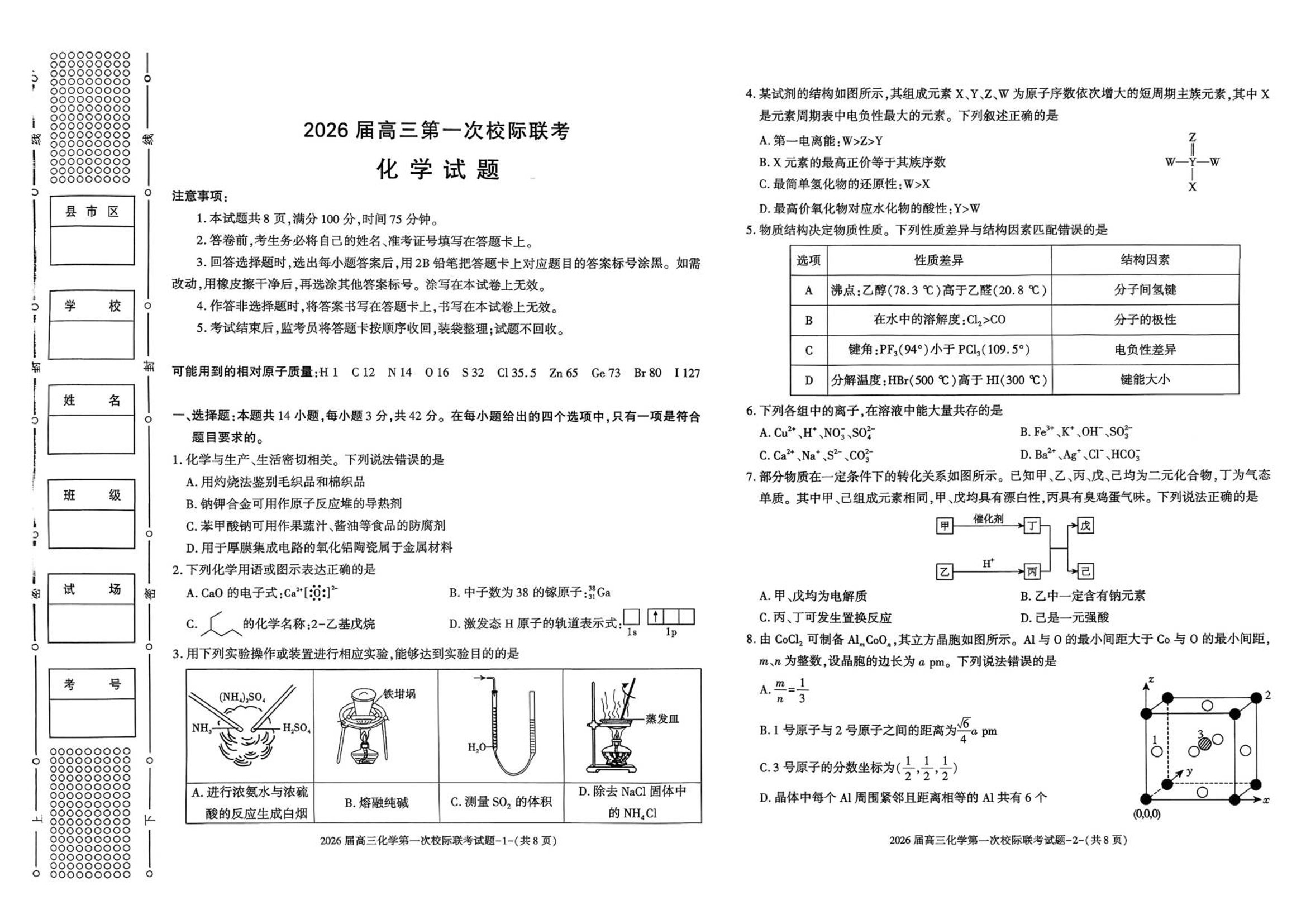 陕西省汉中市2026届高三上学期第一次校际联考 化学试卷(含答案).pdf