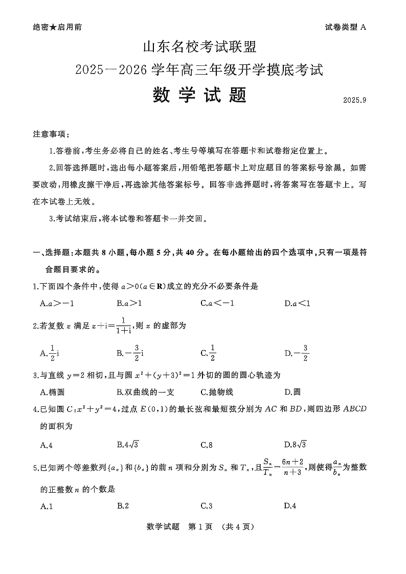 山东名校考试联盟2025-2026学年高三年级开学摸底考试 数学.pdf