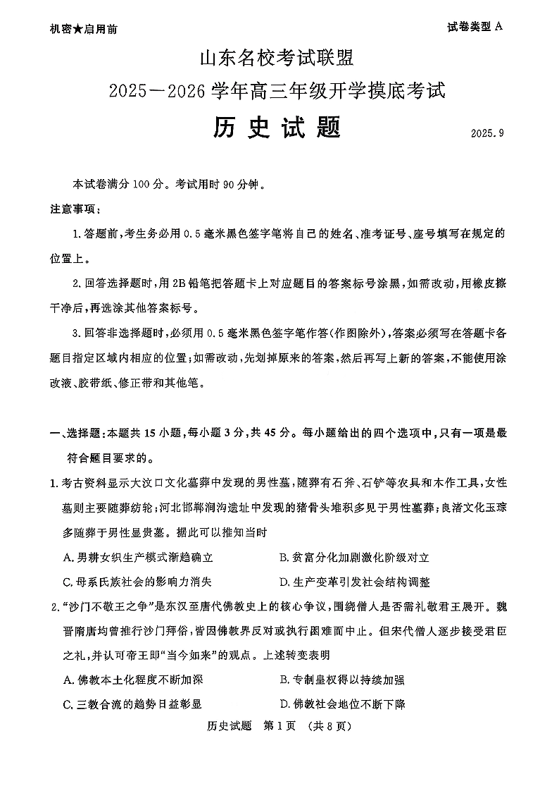 山东名校考试联盟2025-2026学年高三年级开学摸底考试 历史.pdf