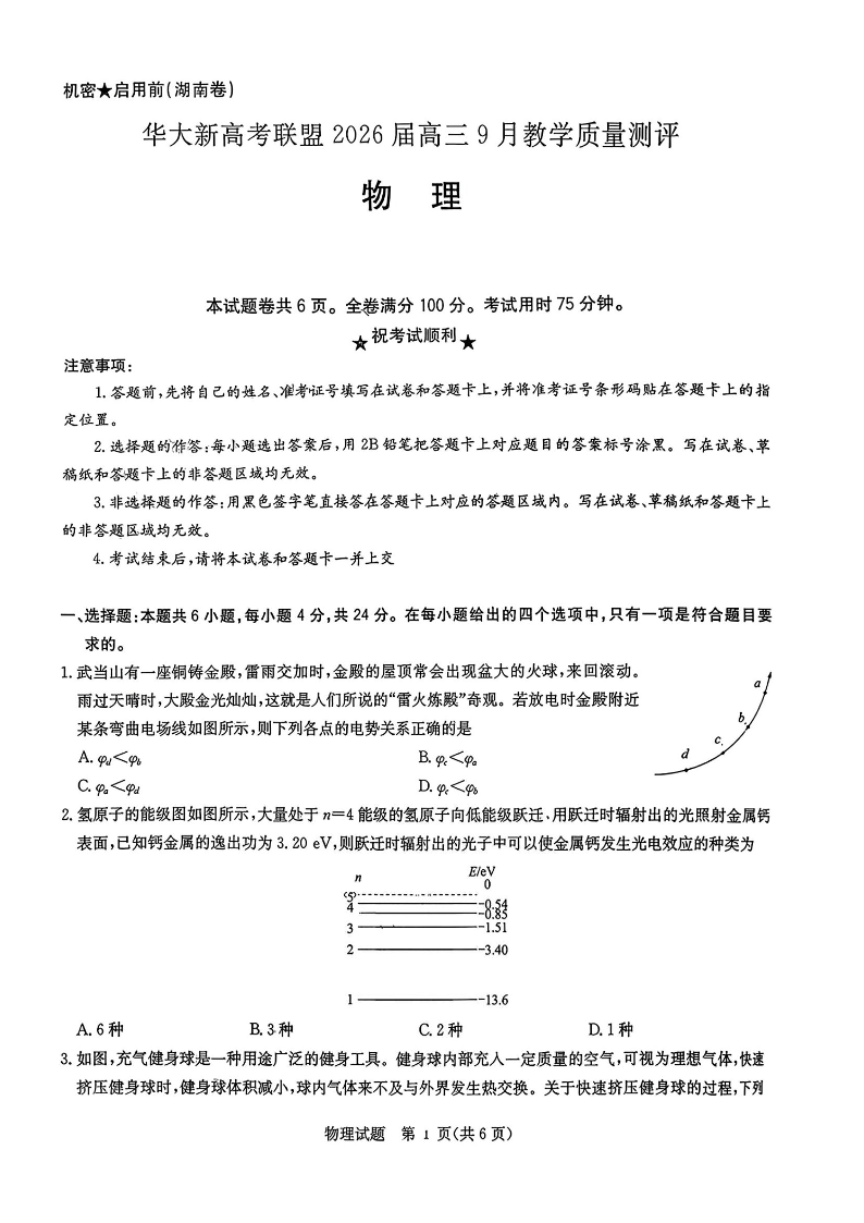 华大新高考联盟2026届高三9月教学质量测评 物理.pdf